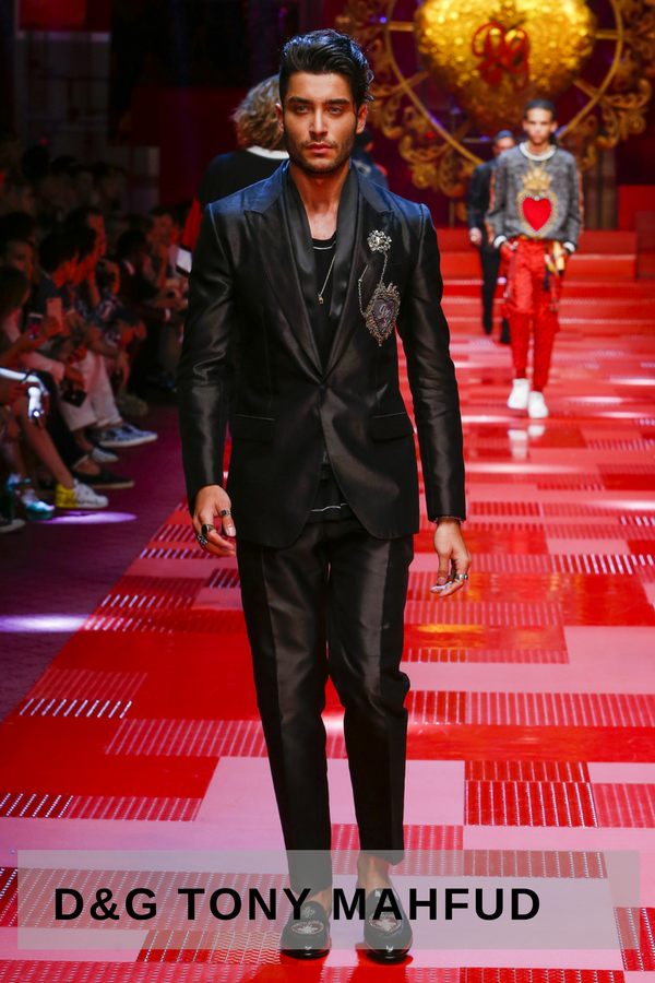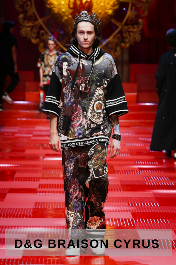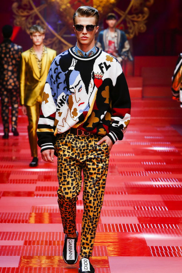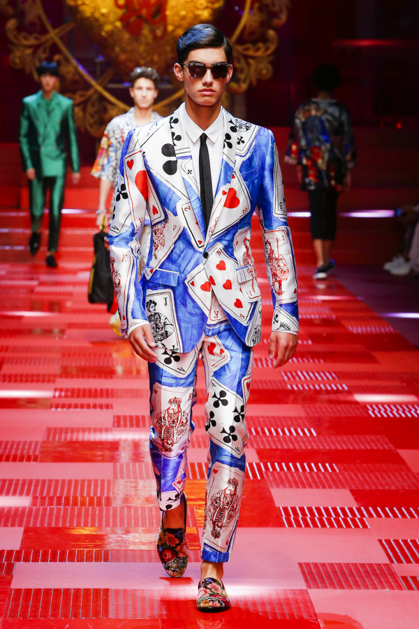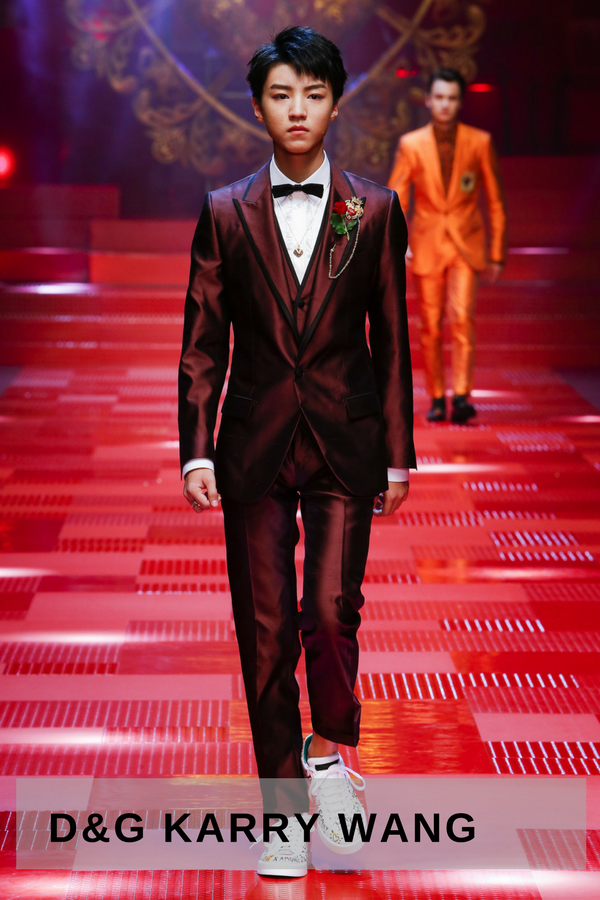 It started actually at their fashion show. Picture a royal scenario, teenage Chinese music band leader Karry Wang opens the Dolce & Gabbana summer collection 2018 fashion show. He is wearing a Bordeaux satin silk suit with embroidered leather sneakers. The beginning of an unforgettable show led by second-row famous walkers.