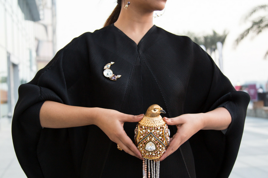 All the pieces of jewelry she is wearing are part of her collection. The moon brooch, the earrings, and the bag. Mind you, the bag is a surprise that will let you in awe. The bag is composed of many pieces. But at the same time, each of those pieces is a unique piece of jewelry that can be removed from the frame. So, you can detach from the bag, a pendant, a ring, a set of earrings, a bracelet etc.. and all together they compose the bird shape bag. Totally cool and royal!
