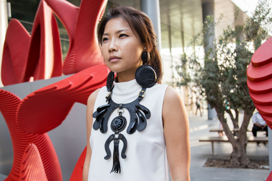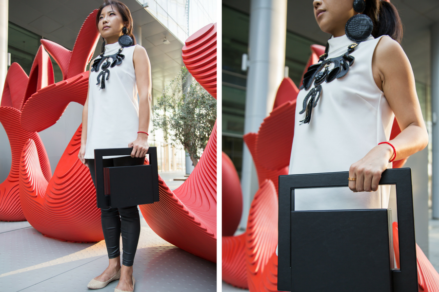 Taiwen Chen, our beauty editor, selected a black minimalistic square bag that goes perfectly with this oversized leather necklace and matching earrings. All of it, coming from The Cartel.