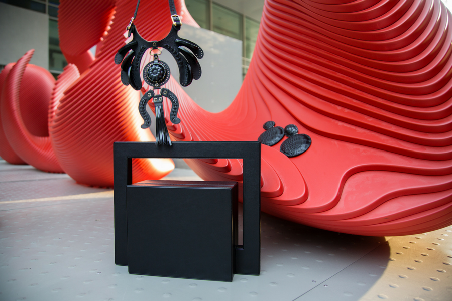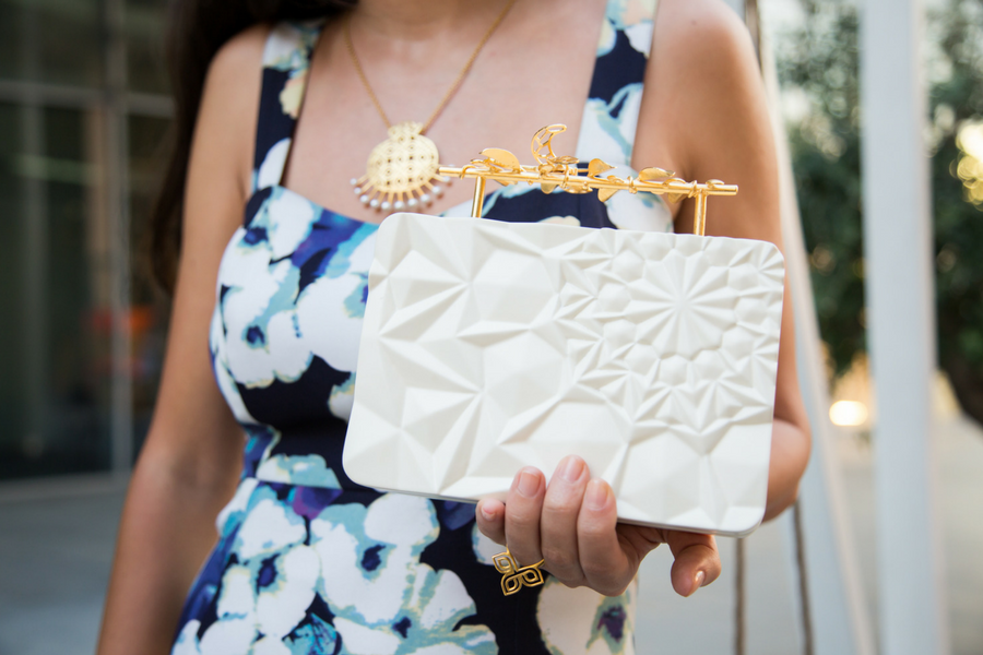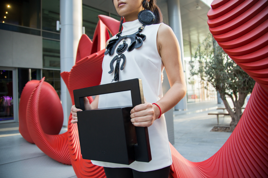 Marta Garrido, our Arts & Lifestyle editor, selected this gorgeous clutch from Rula Galayini. She matched it with a gorgeous hand-painted silk scarf from Charlotte Hudders and a very architectural pendant from Margherita.