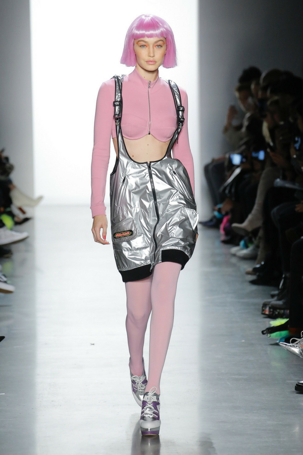 We can say that this collection is kind of futuristic. Gigi marched with a pink crop top-like jacket and metallic overall.