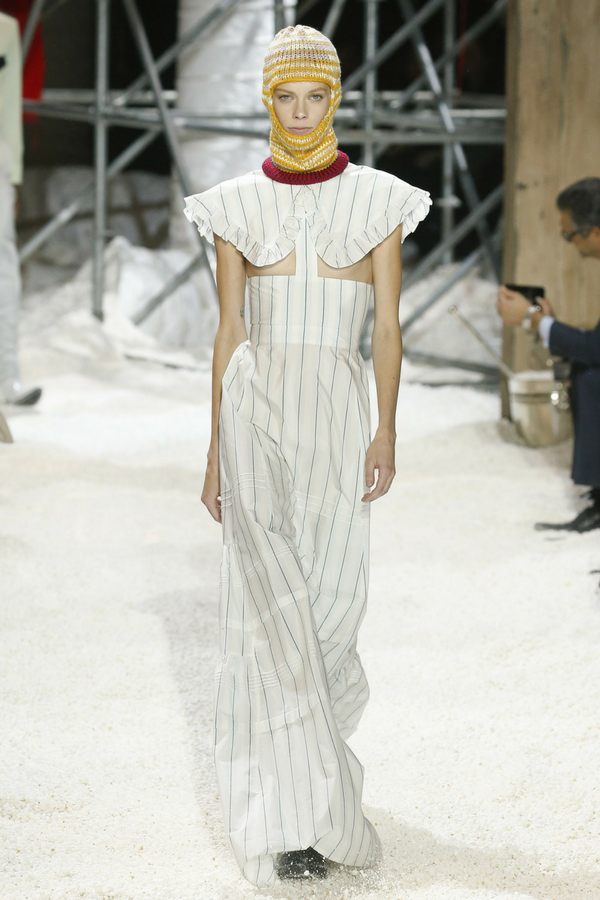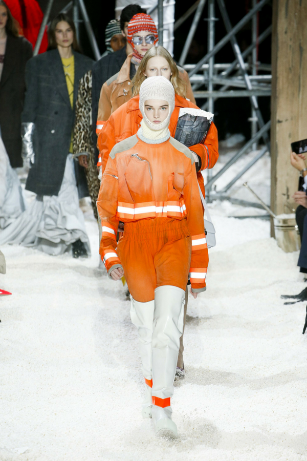 Raf Simons is known for his eccentric designs and this time he surprised us with drifts of popcorn representing snow and burned barns form the 19th century. Even some models carried popcorn bags.
